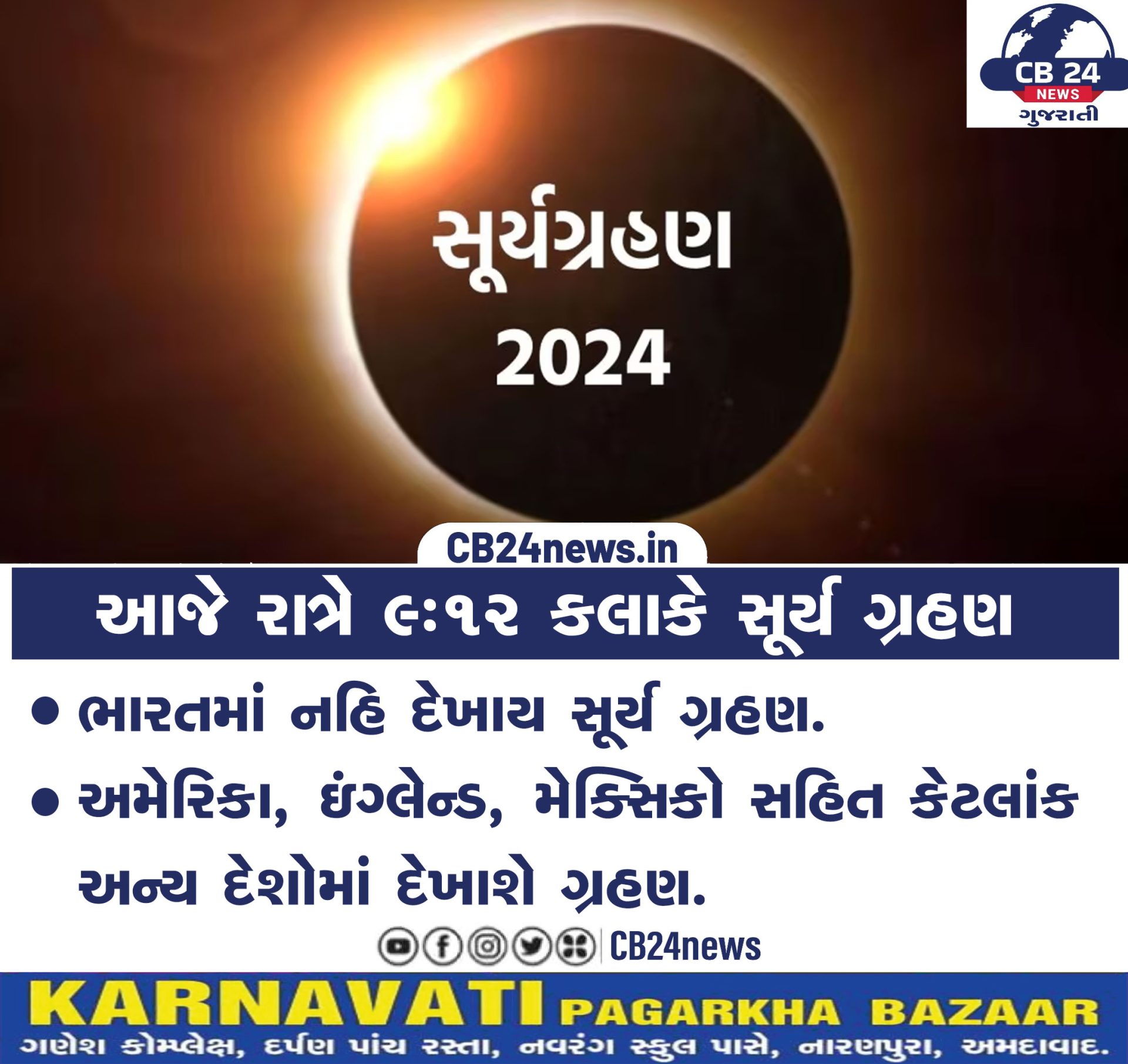 આજે રાત્રે ૯:૧૨ કલાકે સૂર્ય ગ્રહણ