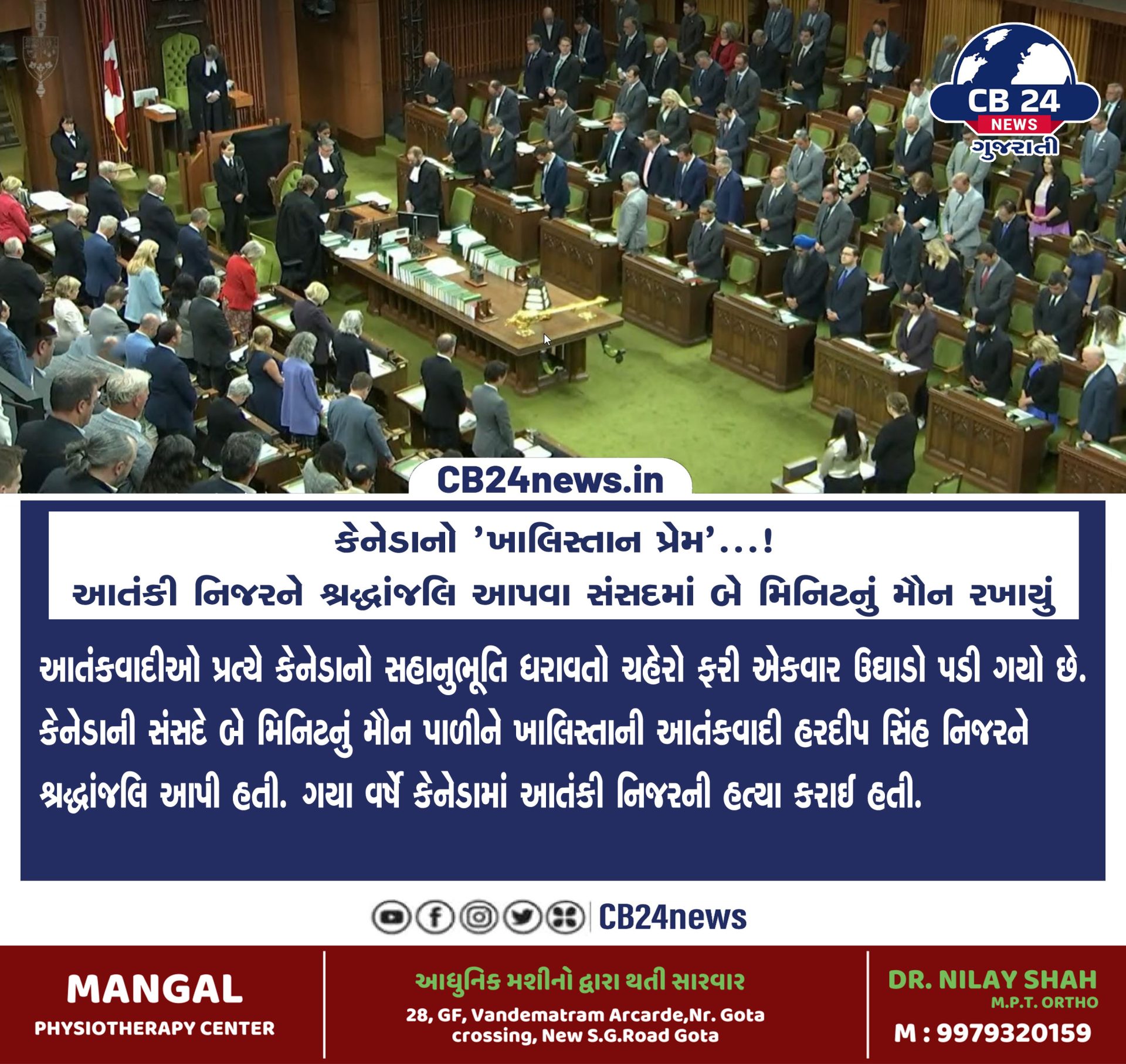 કેનેડાનો ‘ખાલિસ્તાન પ્રેમ’…! આતંકી નિજરને શ્રદ્ધાંજલિ આપવા સંસદમાં બે મિનિટનું મૌન રખાયું June 19, 2024 by Cb 24 News