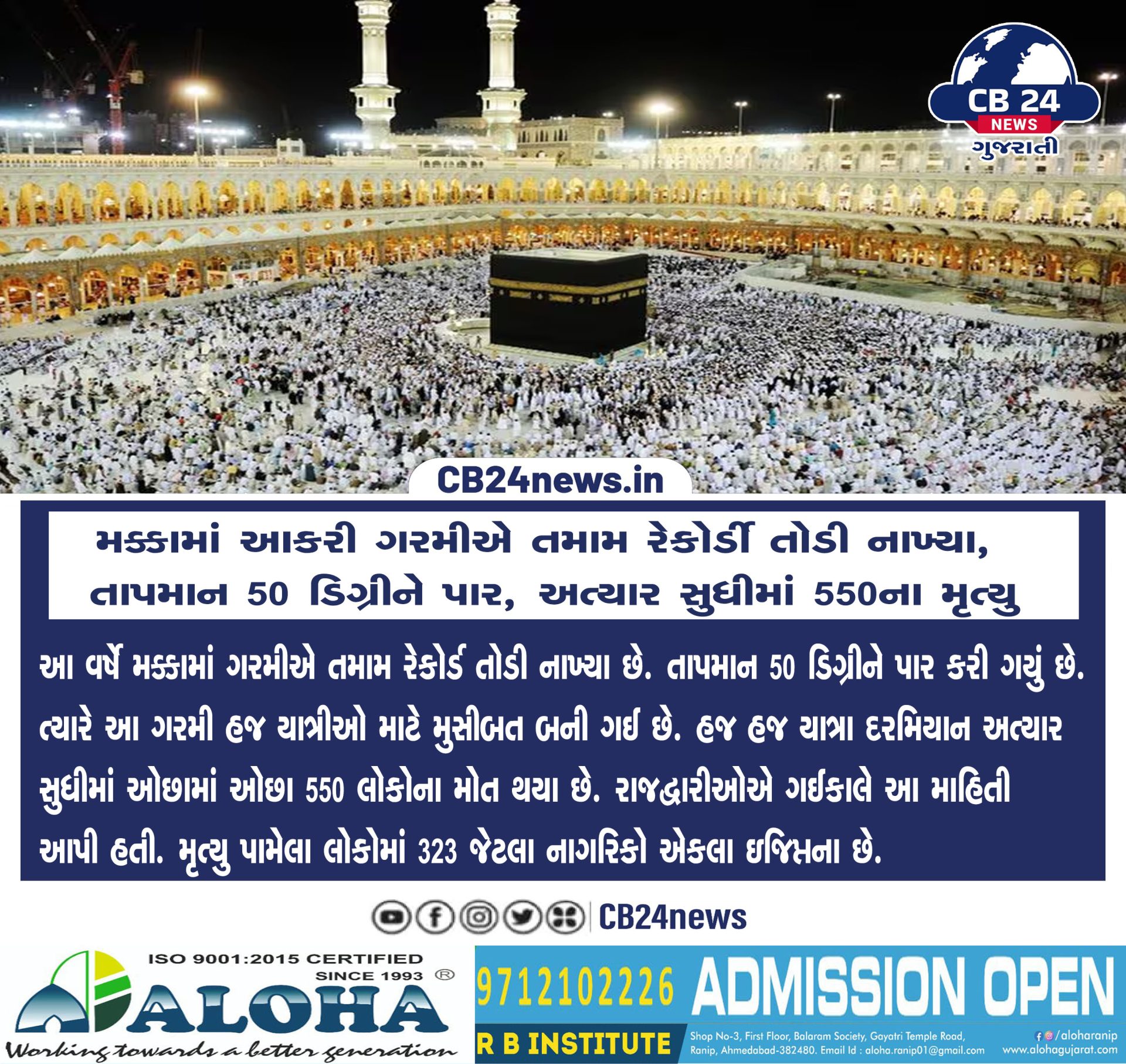 મક્કામાં આકરી ગરમીએ તમામ રેકોર્ડી તોડી નાખ્યા, તાપમાન ૫૦ ડિગ્રીને પાર, અત્યાર સુધીમાં ૫૫૦ના મૃત્યુ June 19, 2024 by Cb 24 News