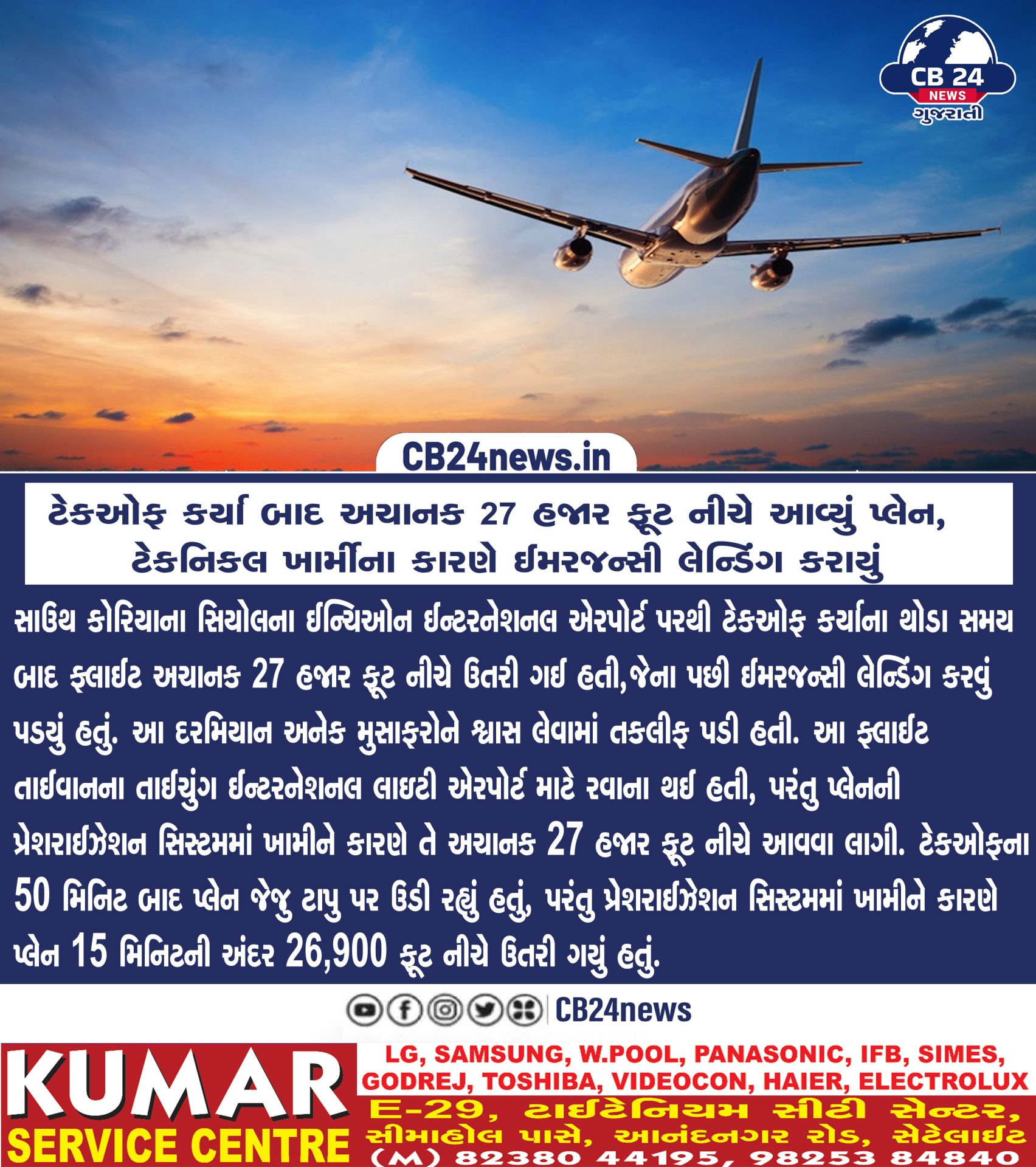 ટેકઓફ કર્યા બાદ અચાનક ૨૭ હજાર ફૂટ નીચે આવ્યું પ્લેન, ટેકનિકલ ખાર્મીના કારણે ઈમરજન્સી લેન્ડિંગ કરાયું June 25, 2024 by Cb 24 News