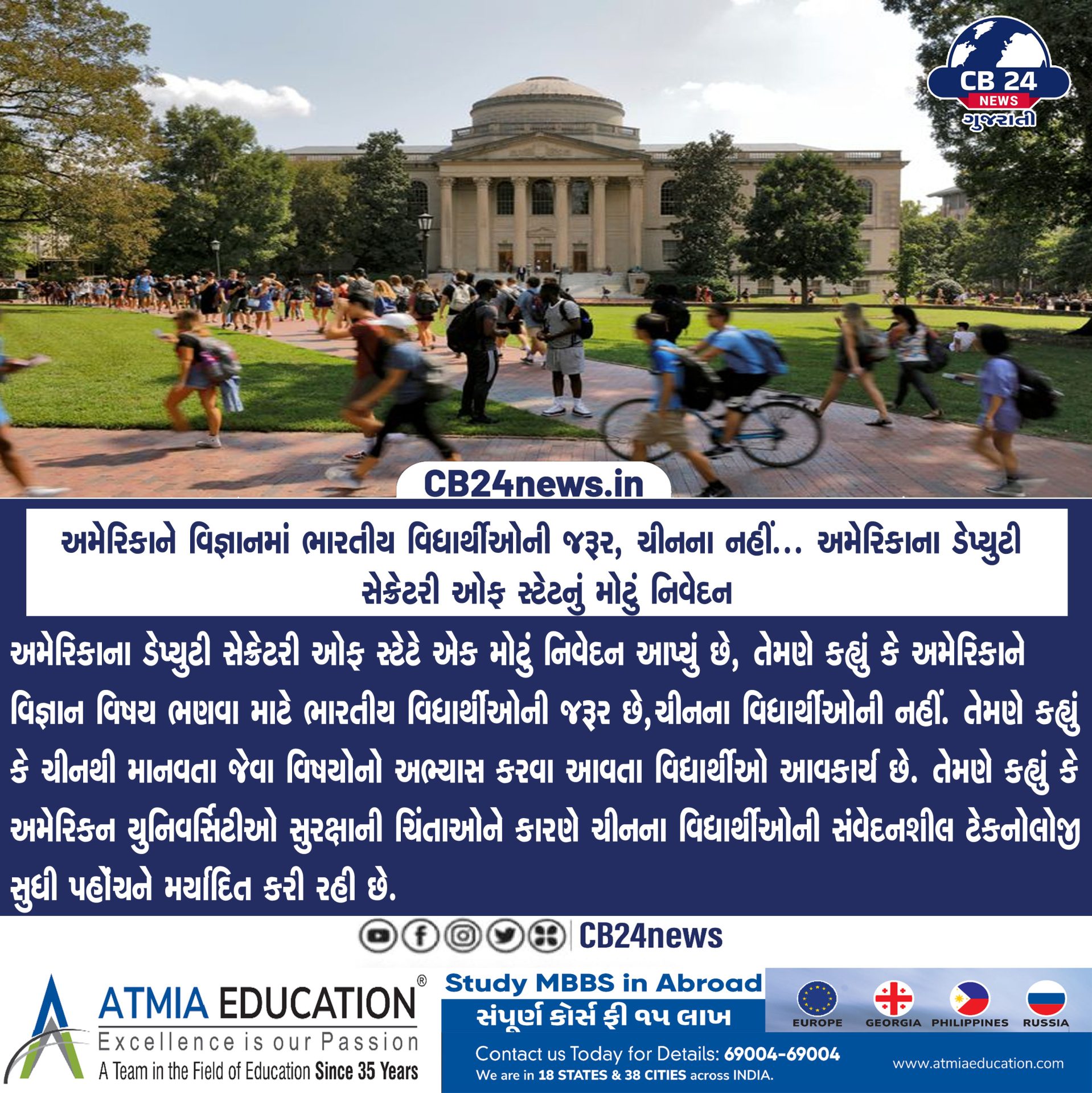 અમેરિકાને વિજ્ઞાનમાં ભારતીય વિધાર્થીઓની જરૂર, ચીનના નહીં… અમેરિકાના ડેપ્યુટી સેક્રેટરી ઓફ સ્ટેટનું મોટું નિવેદન June 25, 2024 by Cb 24 News