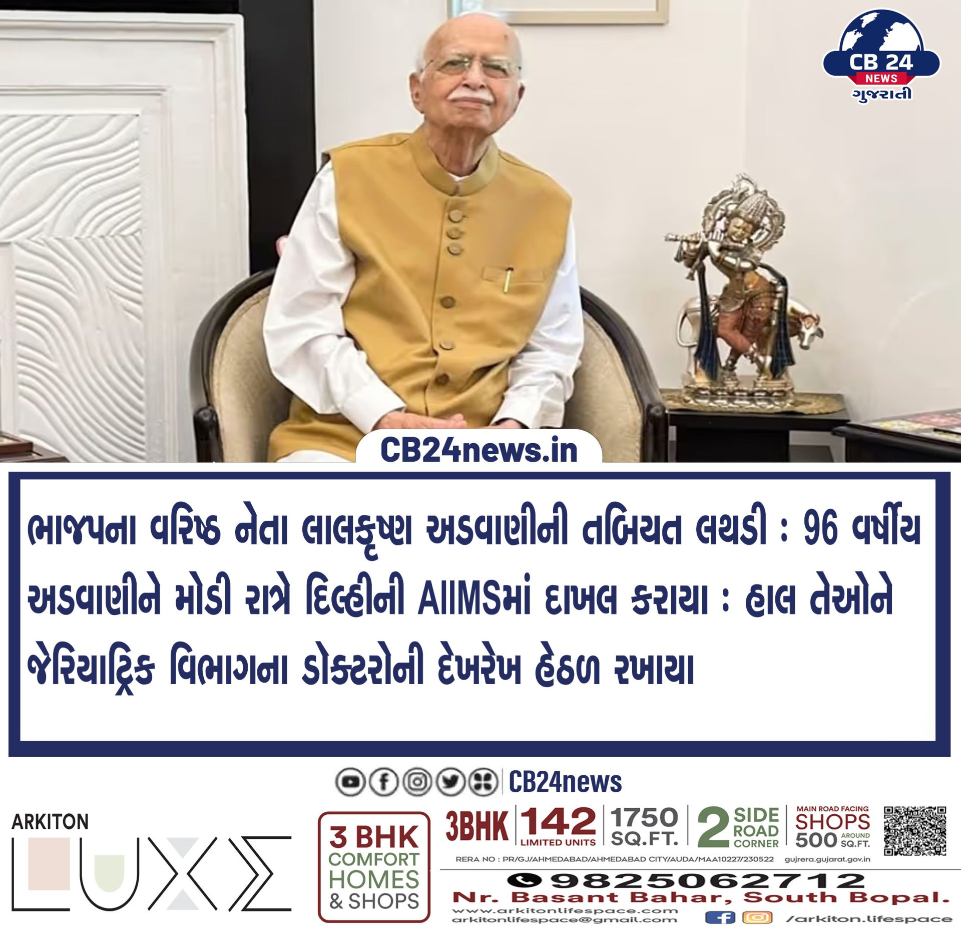 ભાજપના વરિષ્ઠ નેતા લાલકૃષ્ણ અડવાણીની તબિયત લથડી : ૯૬ વર્ષીય અડવાણીને મોડી રાત્રે દિલ્હીની AIIMSમાં દાખલ કરાયા : હાલ તેઓને જેરિયાટ્રિક વિભાગના ડૉક્ટરોની દેખરેખ હેઠળ રખાયા June 27, 2024 by Cb 24 News