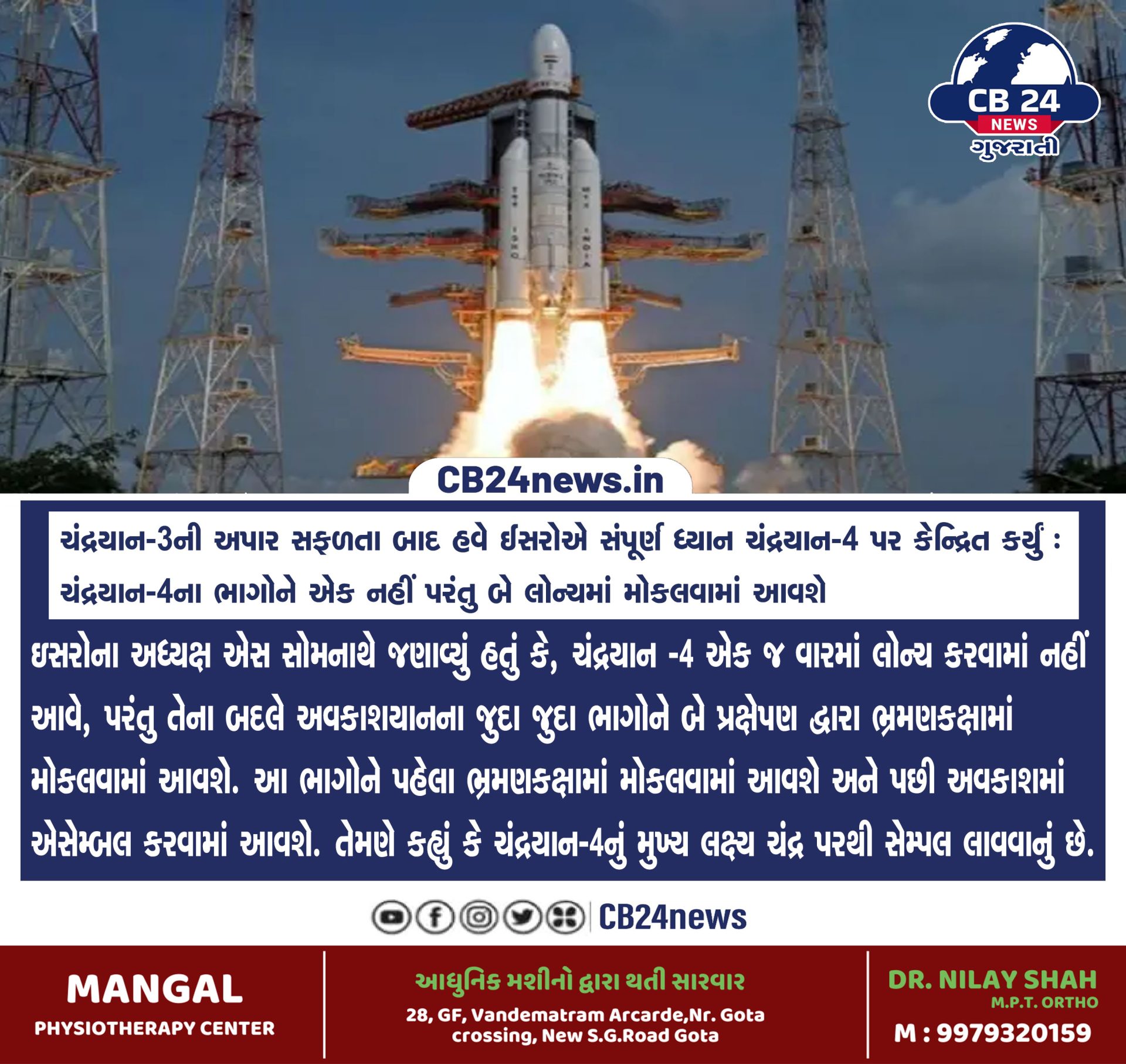 ચંદ્રયાન-3ની અપાર સફળતા બાદ હવે ઈસરોએ સંપૂર્ણ ધ્યાન ચંદ્રયાન-૪ પર કેન્દ્રિત કર્યું : ચંદ્રયાન-૪ના ભાગોને એક નહીં પરંતુ બે લોન્ચમાં મોકલવામાં આવશે June 27, 2024 by Cb 24 News