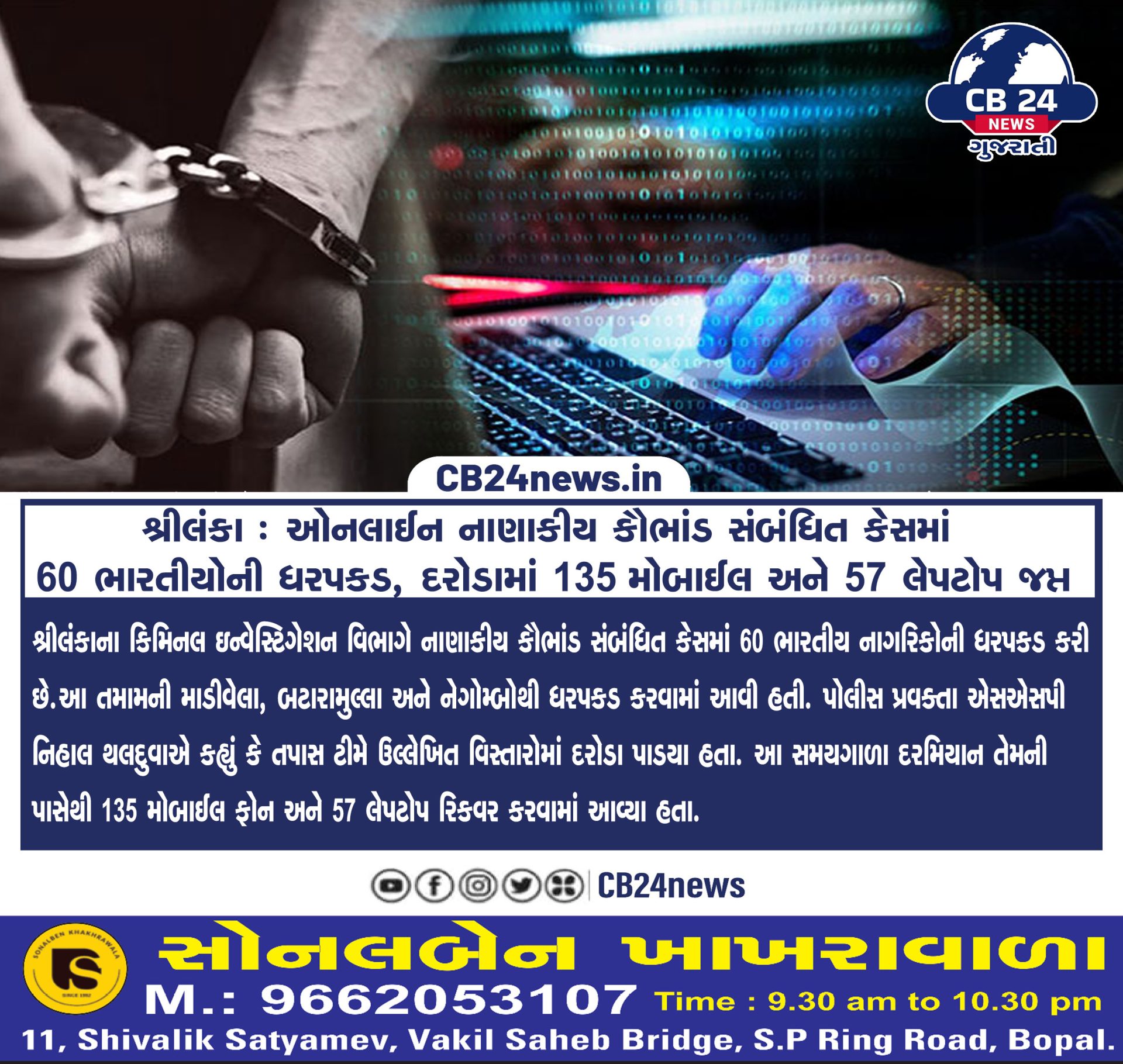 શ્રીલંકા : ઓનલાઈન નાણાકીય કૌભાંડ સંબંધિત કેસમાં ૬૦ ભારતીયોની ધરપકડ, દરોડામાં ૧૩૫ મોબાઈલ અને ૫૭ લેપટોપ જપ્ત June 28, 2024 by Cb 24 News