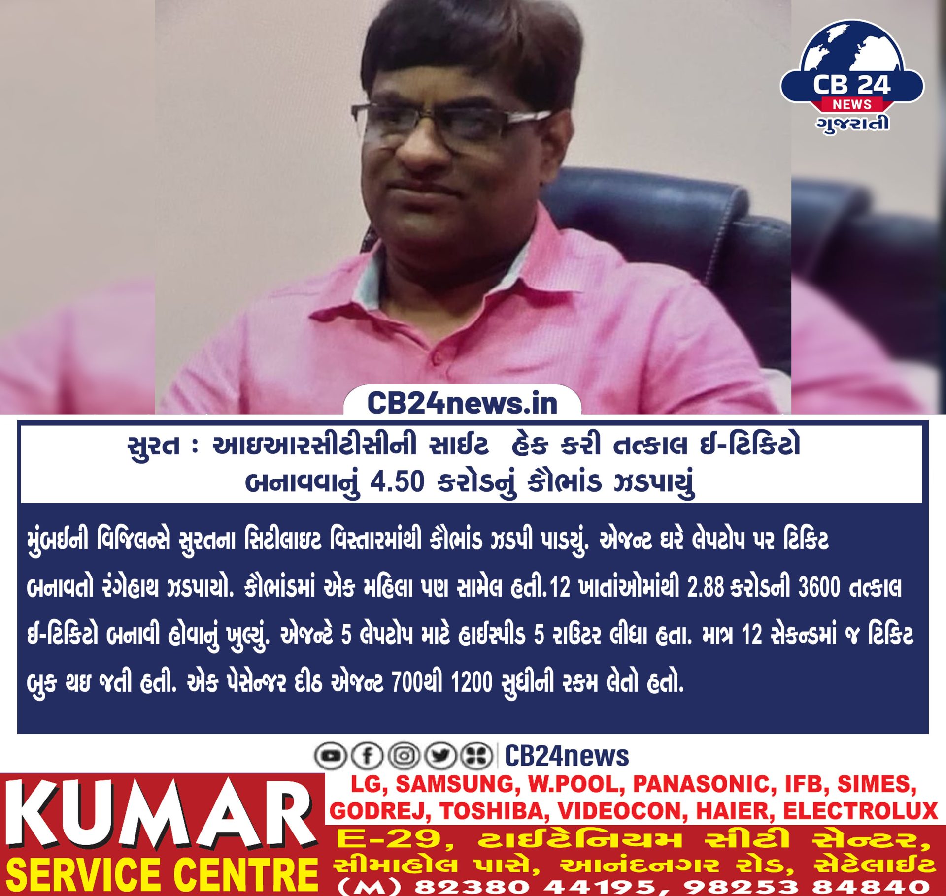 સુરત : આઇઆરસીટીસીની સાઈટ હેક કરી તત્કાલ ઈ-ટિકિટો બનાવવાનું ૪.૫૦ કરોડનું કૌભાંડ ઝડપાયું June 28, 2024 by Cb 24 News