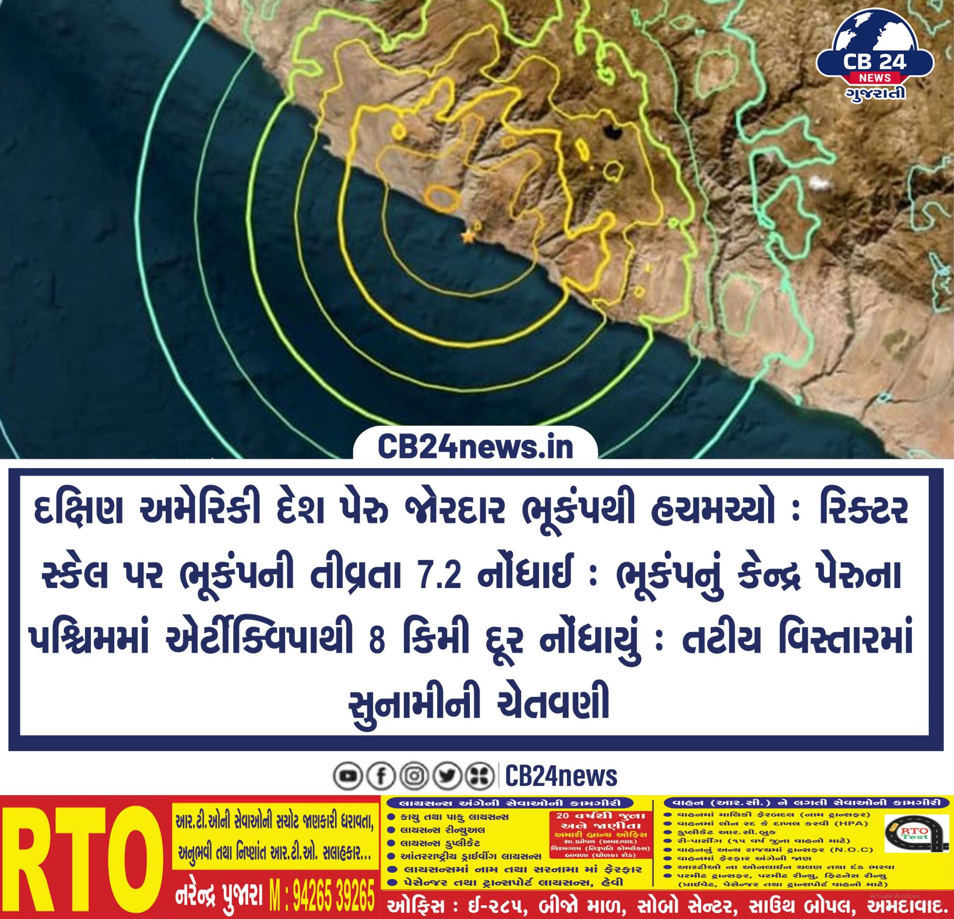 દક્ષિણ અમેરિકી દેશ પેરુ જોરદાર ભૂકંપથી હચમચ્યો : રિક્ટર સ્કેલ પર ભૂકંપની તીવ્રતા ૭.૨ નોંધાઈ : ભૂકંપનું કેન્દ્ર પેરુના પશ્ચિમમાં એર્ટીક્વિપાથી ૮ કિમી દૂર નોંધાયું : તટીય વિસ્તારમાં સુનામીની ચેતવણી June 28, 2024 by Cb 24 News