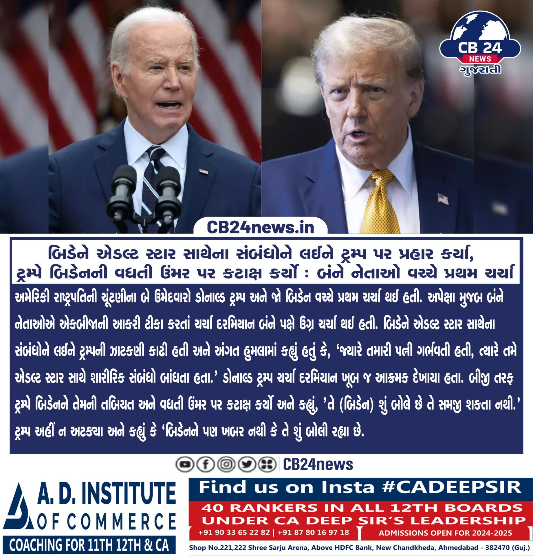 બિડેને એડલ્ટ સ્ટાર સાથેના સંબંધોને લઈને ટ્રમ્પ પર પ્રહાર કર્યા, ટ્રમ્પે બિડેનની વધતી ઉંમર પર કટાક્ષ કર્યો : બંને નેતાઓ વચ્ચે પ્રથમ ચર્ચા દરમિયાન શાબ્દિક પ્રહારને કારણે હંગામો June 28, 2024 by Cb 24 News