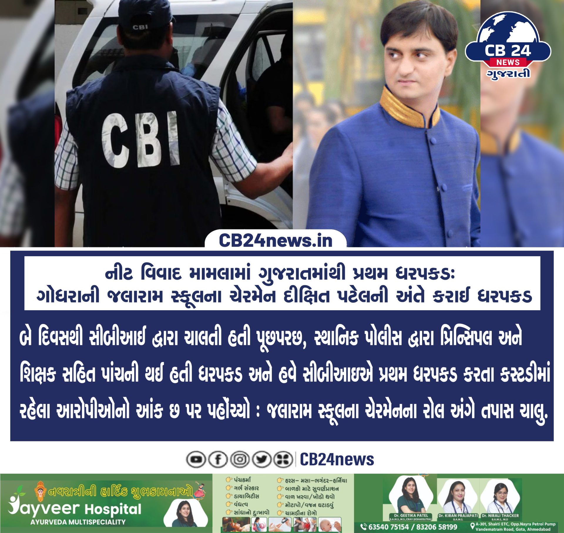 નીટ વિવાદ મામલામાં ગુજરાતમાંથી પ્રથમ ધરપકડ: ગોધરાની જલારામ સ્કૂલના ચેરમેન દીક્ષિત પટેલની અંતે કરાઈ ધરપકડ July 1, 2024 by Cb 24 News