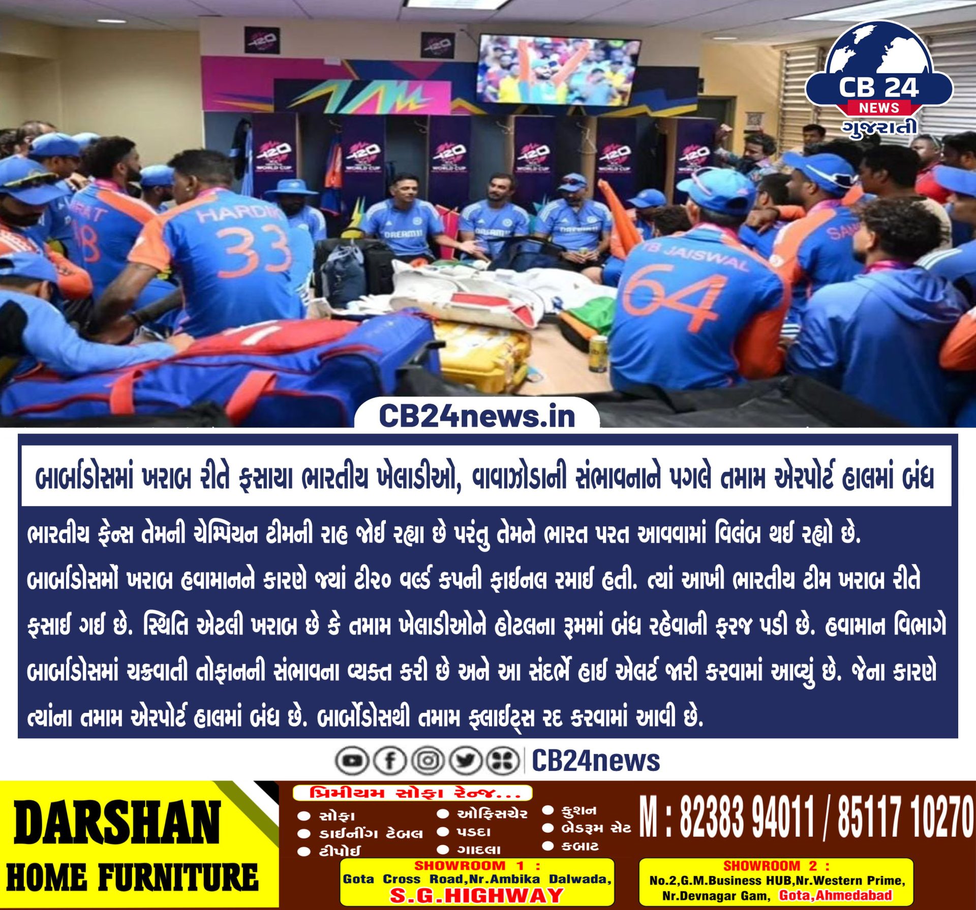 બાર્બાડોસમાં ખરાબ રીતે ફસાયા ભારતીય ખેલાડીઓ, વાવાઝોડાની સંભાવનાને પગલે તમામ એરપોર્ટ હાલમાં બંધ July 1, 2024 by Cb 24 News