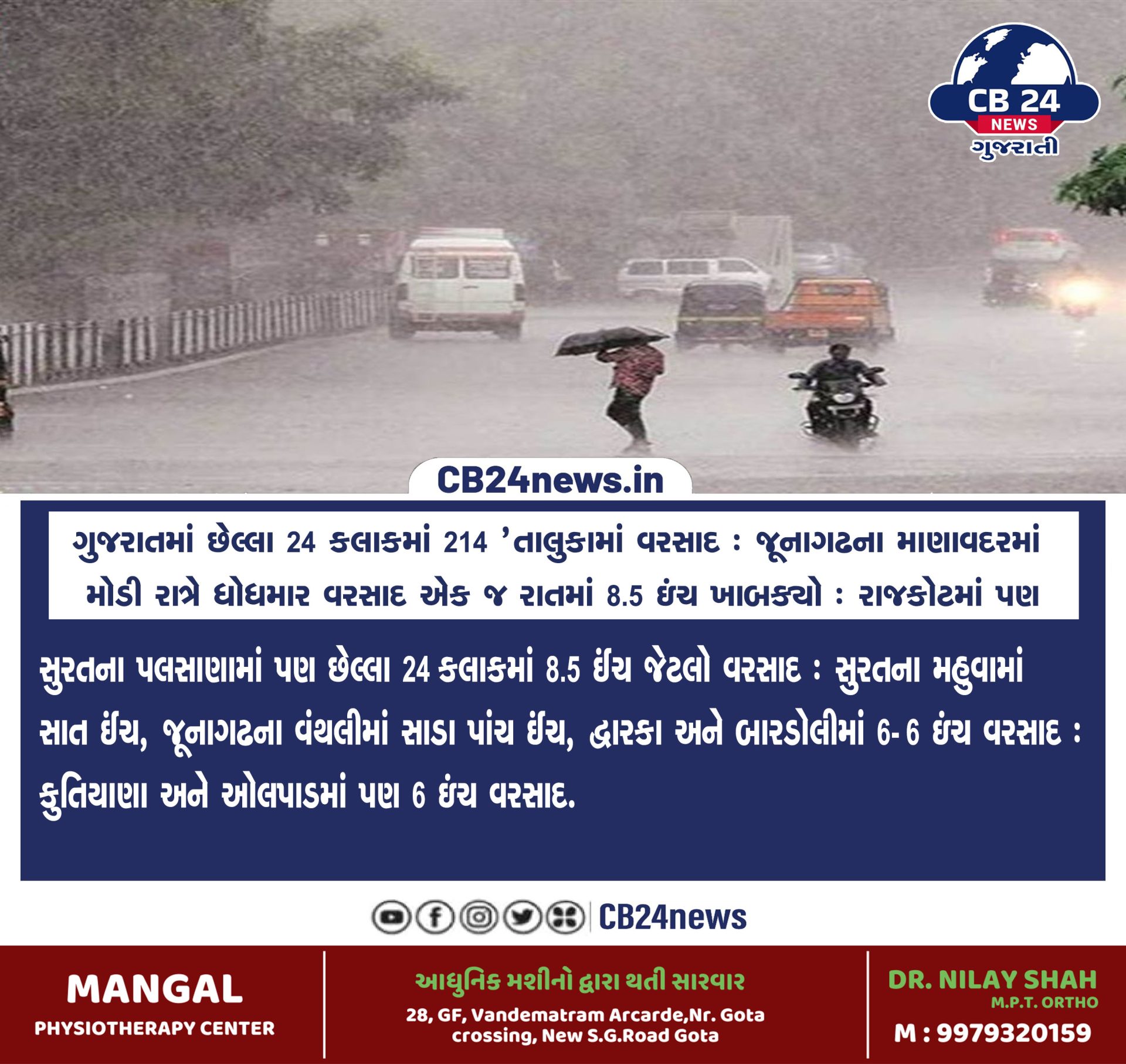 ગુજરાતમાં છેલ્લા ૨૪ કલાકમાં ૨૧૪ ‘તાલુકામાં વરસાદ : જૂનાગઢના માણાવદરમાં મોડી રાત્રે ધોધમાર વરસાદ એક જ રાતમાં ૮.૫ ઇંચ ખાબક્યો : રાજકોટમાં પણ વહેલી સવારથી વરસાદ શરુ July 1, 2024 by Cb 24 News