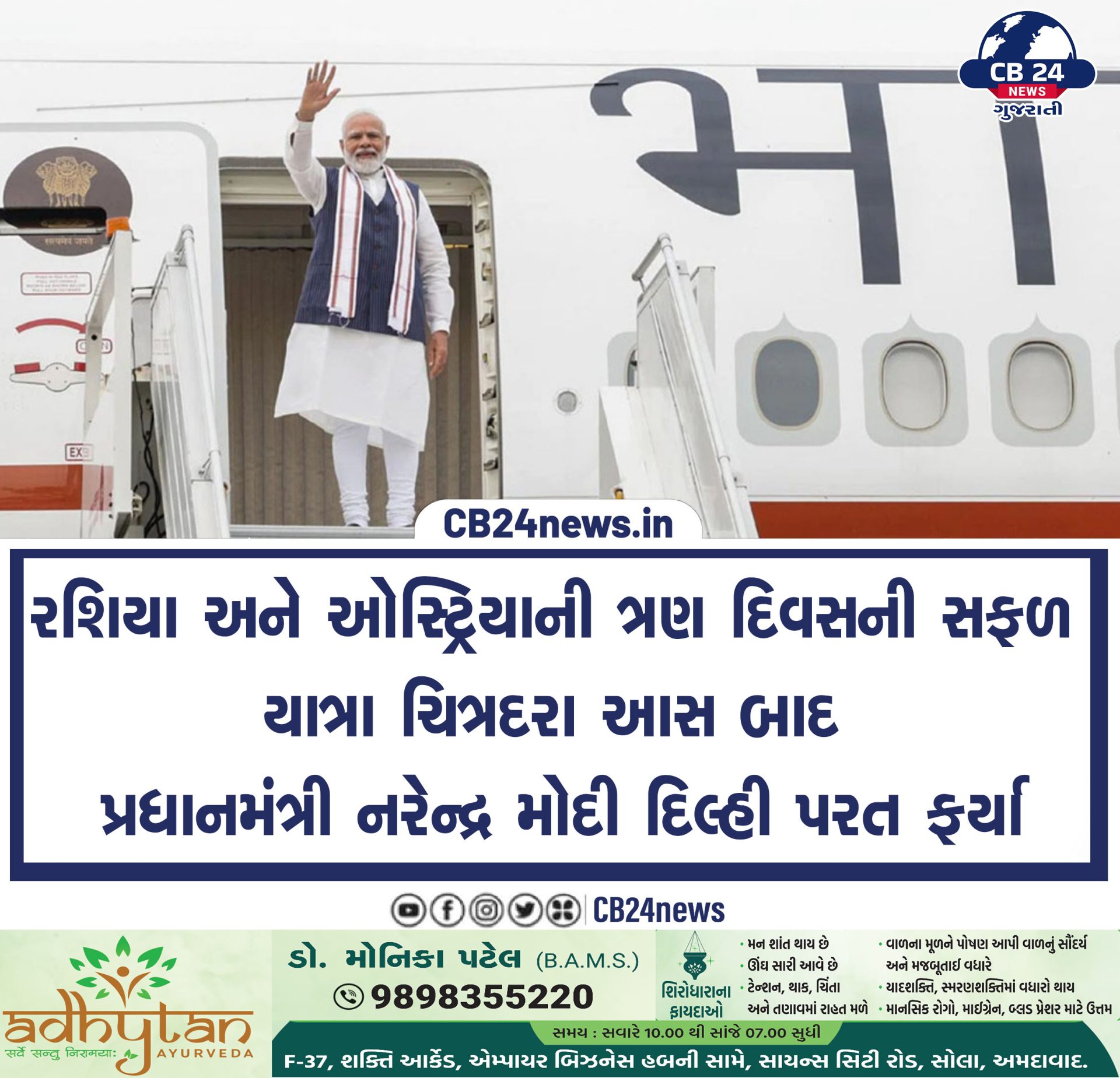 રશિયા અને ઓસ્ટ્રિયાની ત્રણ દિવસની સફળ યાત્રા ચિત્રદરા આસ બાદ પ્રધાનમંત્રી નરેન્દ્ર મોદી દિલ્હી પરત ફર્યા July 11, 2024 by Cb 24 News