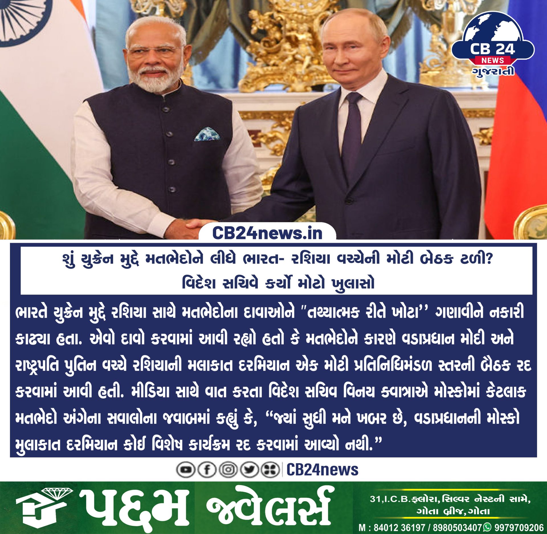 શું યુક્રેન મુદ્દે મતભેદોને લીધે ભારત- રશિયા વચ્ચેની મોટી બેઠક ટળી? વિદેશ સચિવે કર્યો મોટો ખુલાસો July 11, 2024 by Cb 24 News