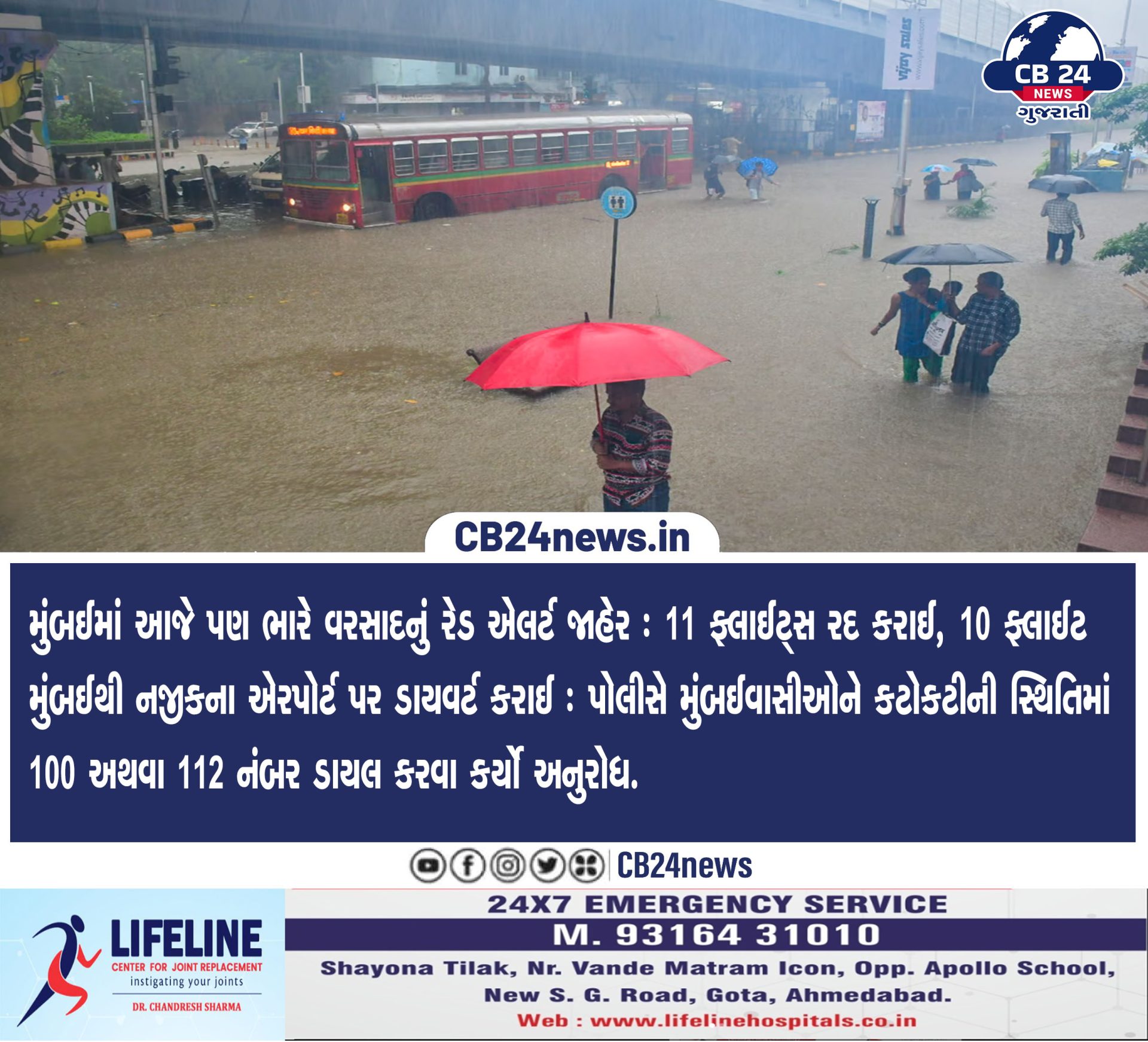 મુંબઈમાં આજે પણ ભારે વરસાદનું રેડ એલર્ટ જાહેર : ૧૧ ફ્લાઈટ્સ રદ કરાઈ, ૧૦ ફ્લાઈટ મુંબઈથી નજીકના એરપોર્ટ પર ડાયવર્ટ કરાઈ : પોલીસે મુંબઈવાસીઓને કટોકટીની સ્થિતિમાં ૧૦૦ અથવા ૧૧૨ નંબર ડાયલ કરવા કર્યો અનુરોધ July 26, 2024 by Cb 24 News