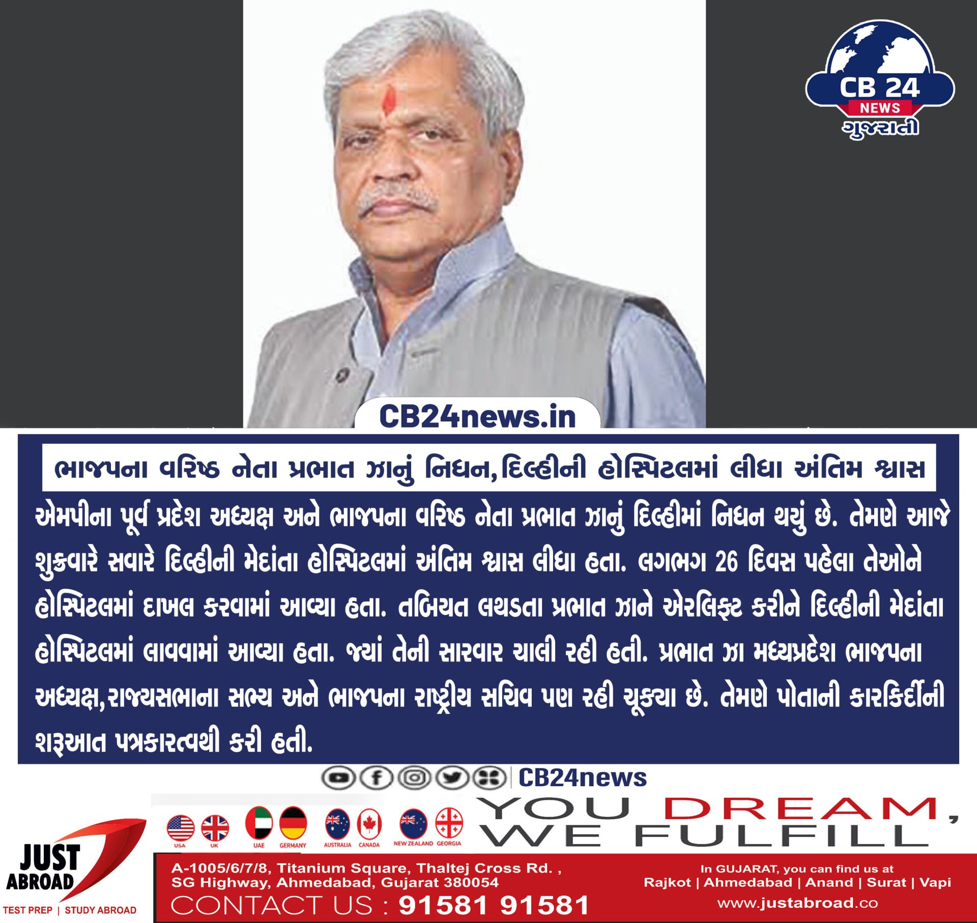 ભાજપના વરિષ્ઠ નેતા પ્રભાત ઝાનું નિધન,દિલ્હીની હોસ્પિટલમાં લીધા અંતિમ શ્વાસ July 26, 2024 by Cb 24 News