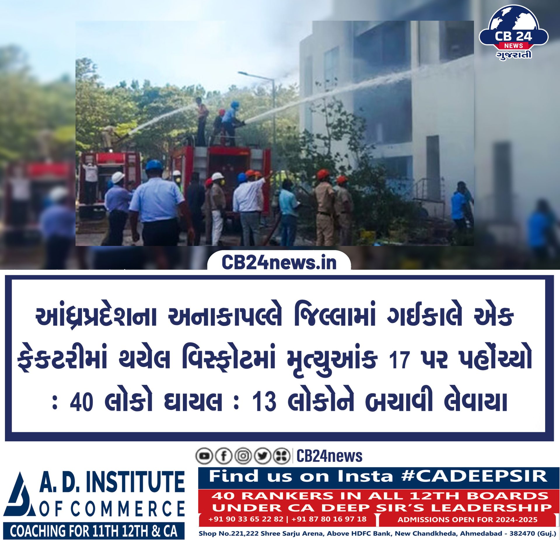 આંધ્રપ્રદેશના અનાકાપલ્લે જિલ્લામાં ગઈકાલે એક ફેકટરીમાં થયેલ વિસ્ફોટમાં મૃત્યુઆંક ૧૭ પર પહોંચ્યો : ૪૦ લોકો ઘાયલ : ૧૩ લોકોને બચાવી લેવાયા August 22, 2024 by Cb 24 News