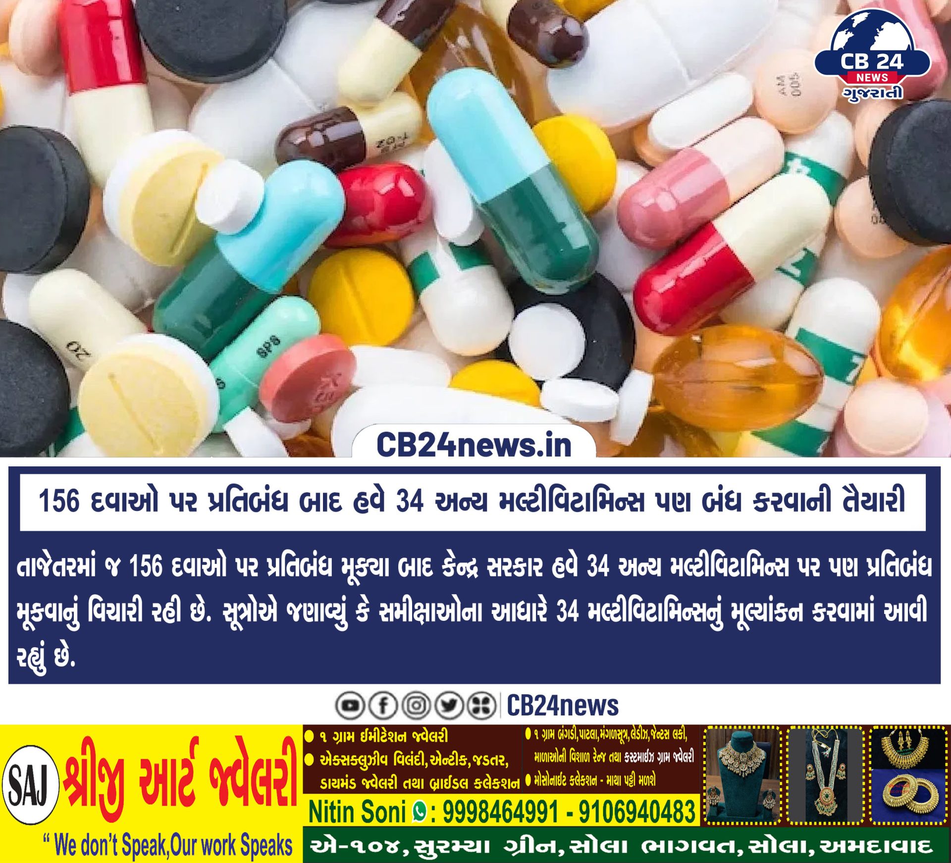 ૧૫૬ દવાઓ પર પ્રતિબંધ બાદ હવે ૩૪ અન્ય મલ્ટીવિટામિન્સ પણ બંધ કરવાની તૈયારી August 24, 2024 by Cb 24 News