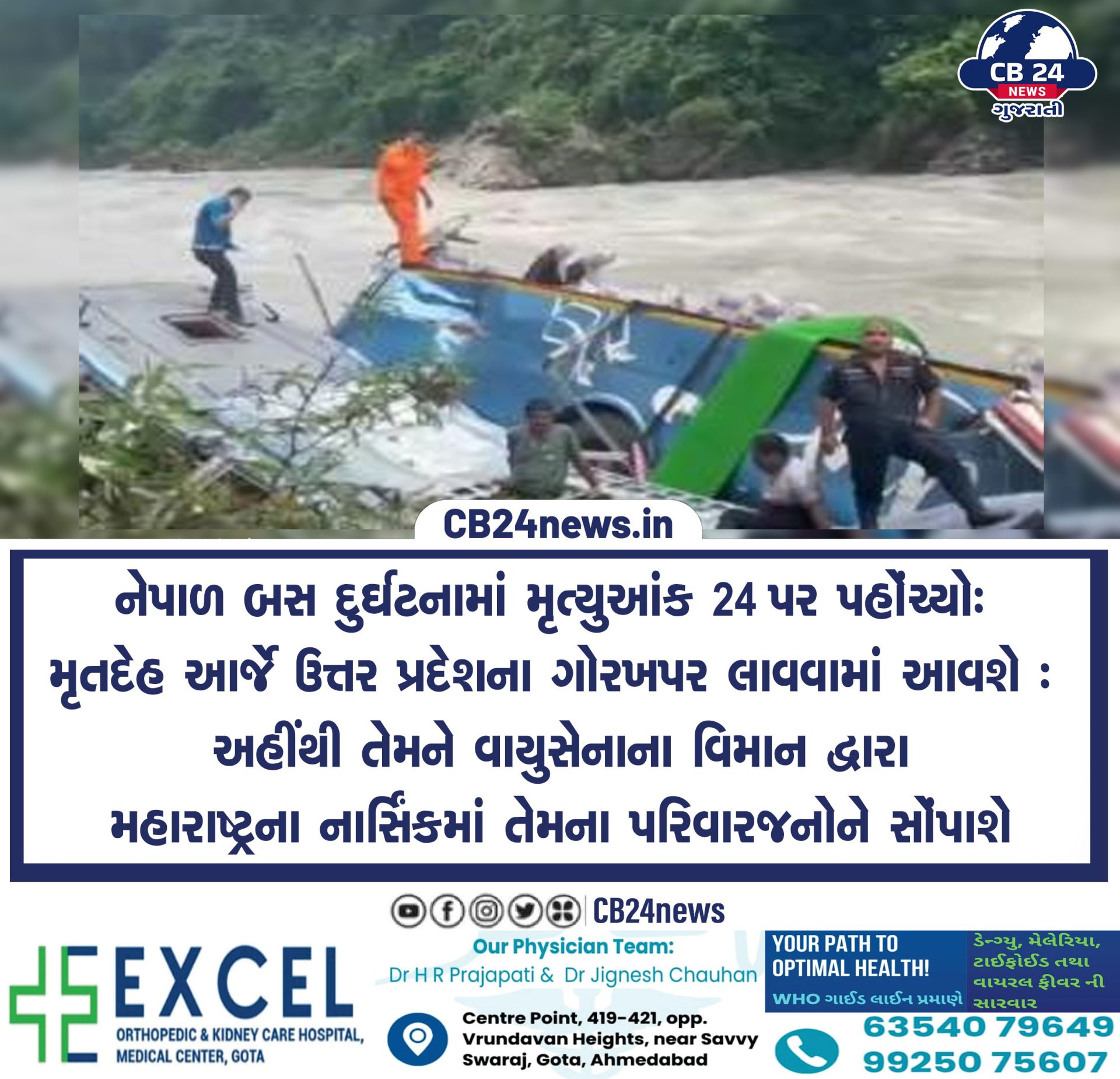 નેપાળ બસ દુર્ઘટનામાં મૃત્યુઆંક ૨૪ પર પહોંચ્યોઃ મૃતદેહ આર્જે ઉત્તર પ્રદેશના ગોરખપર લાવવામાં આવશે ઃ અહીંથી તેમને વાયુસેનાના વિમાન દ્વારા મહારાષ્ટ્રના નાર્સિંકમાં તેમના પરિવારજનોને સોંપાશે August 24, 2024 by Cb 24 News