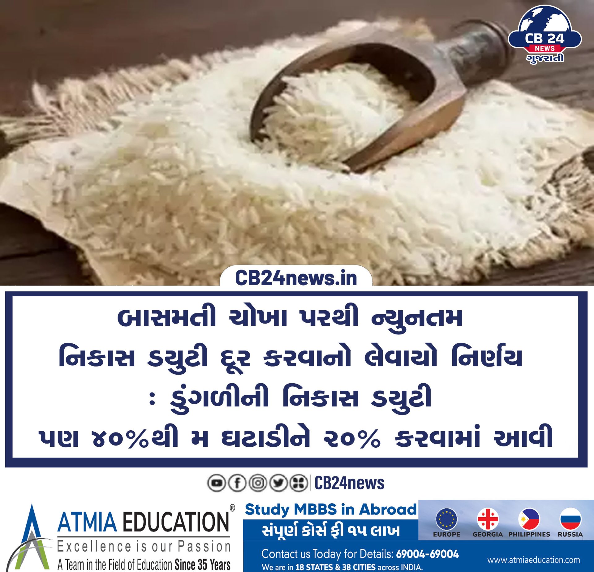 બાસમતી ચોખા પરથી ન્યુનતમ નિકાસ ડયુટી દૂર કરવાનો લેવાયો નિર્ણય : ડુંગળીની નિકાસ ડયુટી પણ ૪૦%થી મ ઘટાડીને ૨૦% કરવામાં આવી September 14, 2024 Read More »
