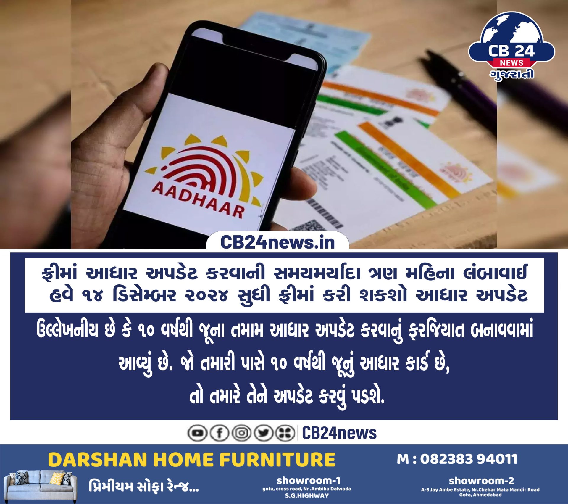 ફ્રીમાં આધાર અપડેટ કરવાની સમયમર્યાદા ત્રણ મહિના લંબાવાઈ હવે ૧૪ ડિસેમ્બર ૨૦૨૪ સુધી ફ્રીમાં કરી શકશો આધાર અપડેટ September 14, 2024 Read More »