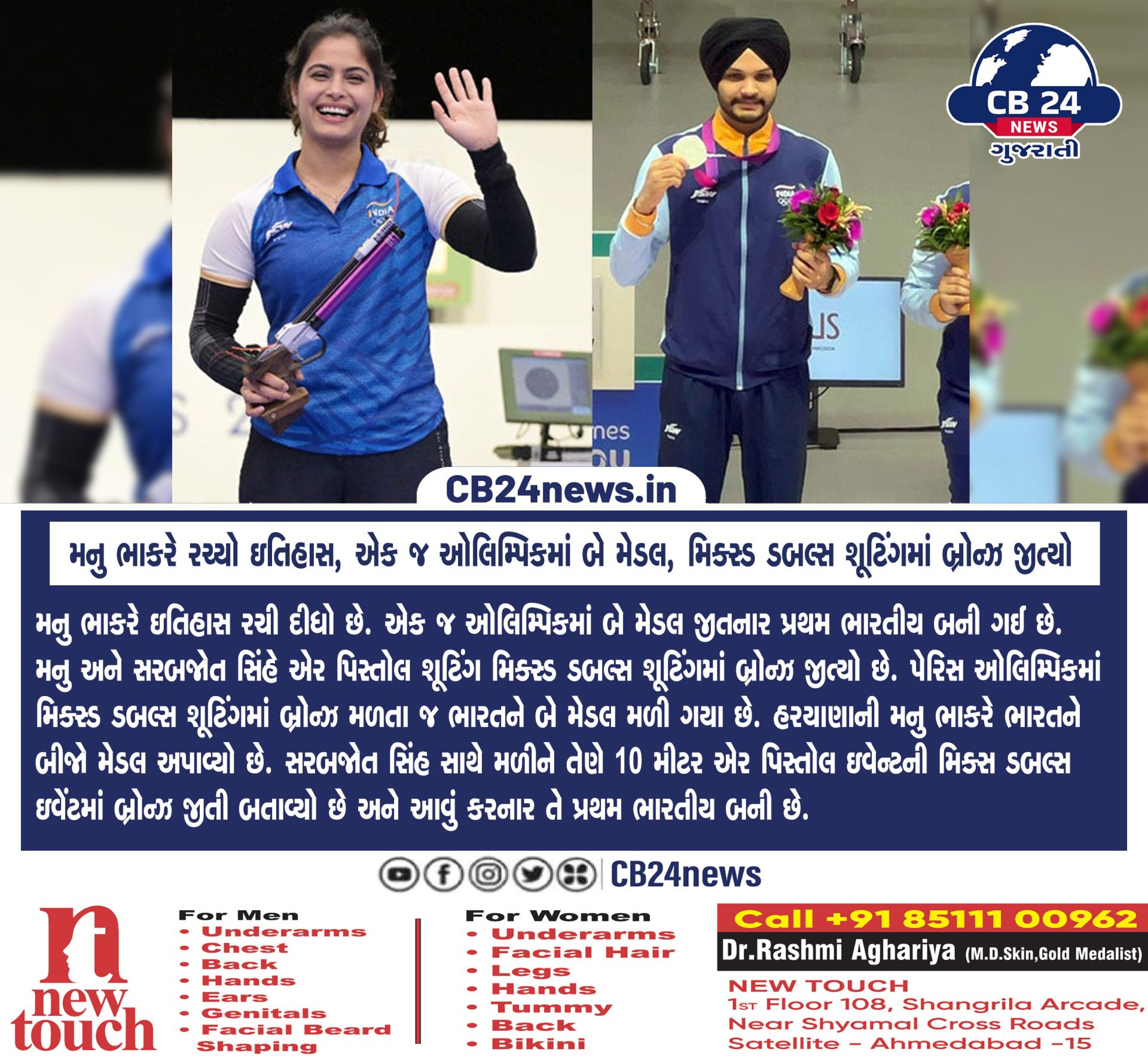 મનુ ભાકરે રચ્યો ઇતિહાસ, એક જ ઓલિમ્પિકમાં બે મેડલ, મિક્સ્ડ ડબલ્સ શૂટિંગમાં બ્રોન્ઝ જીત્યો July 30, 2024 Read More »